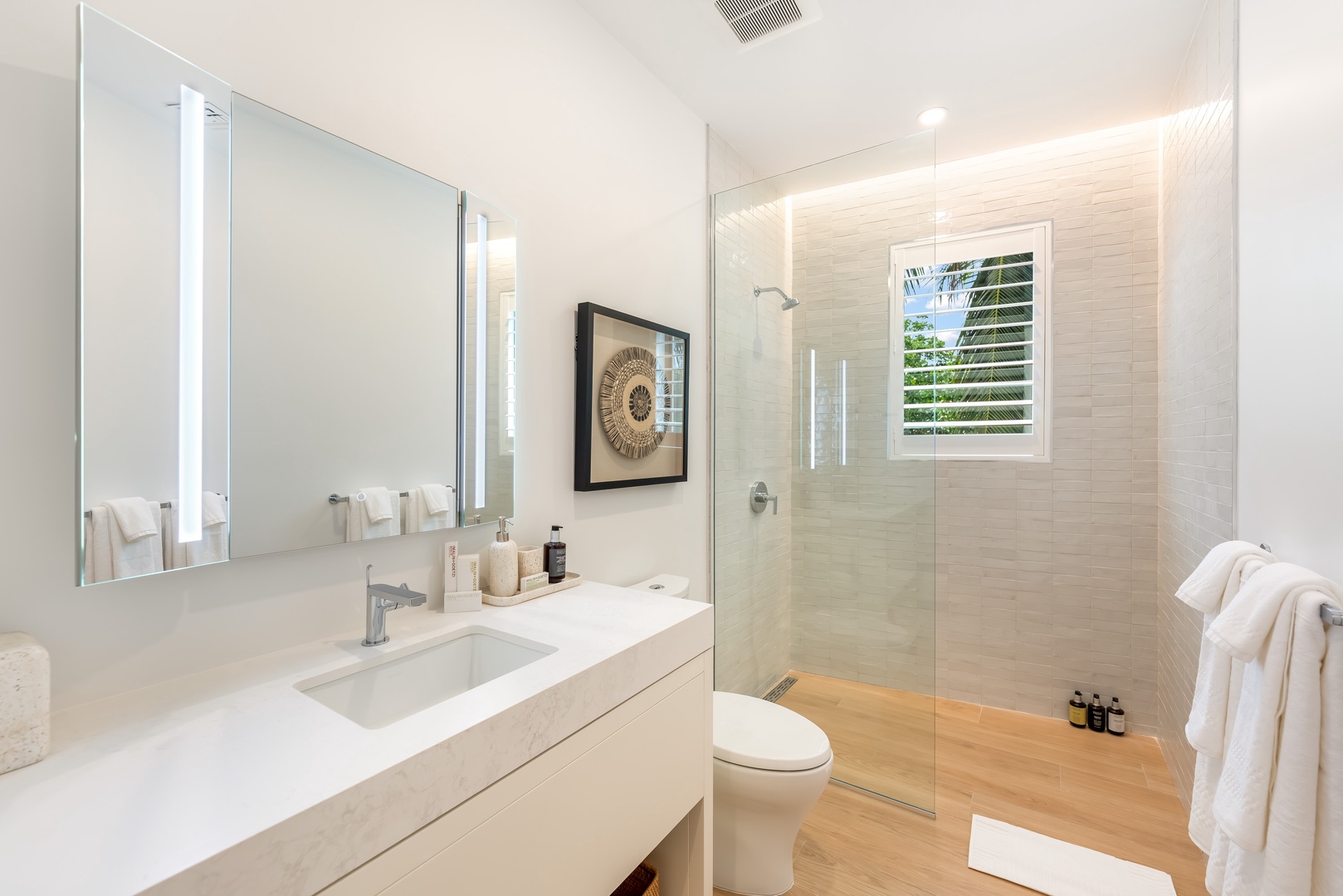 - Bedroom 1: primary suite, king bed, garden views, walk-in closet, guest safe, ensuite with dual vanity, soaking bathtub, and separate shower.