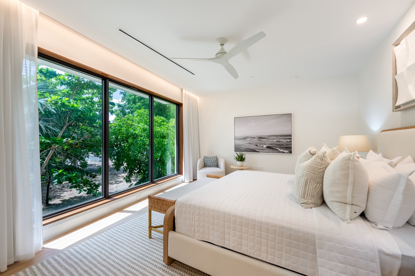 - Bedroom 4: king bed, garden views, closet, ensuite with shower.