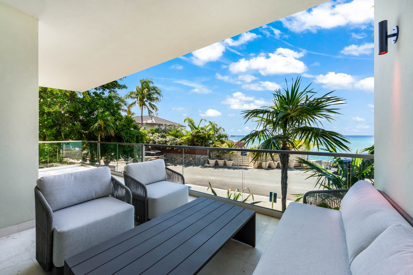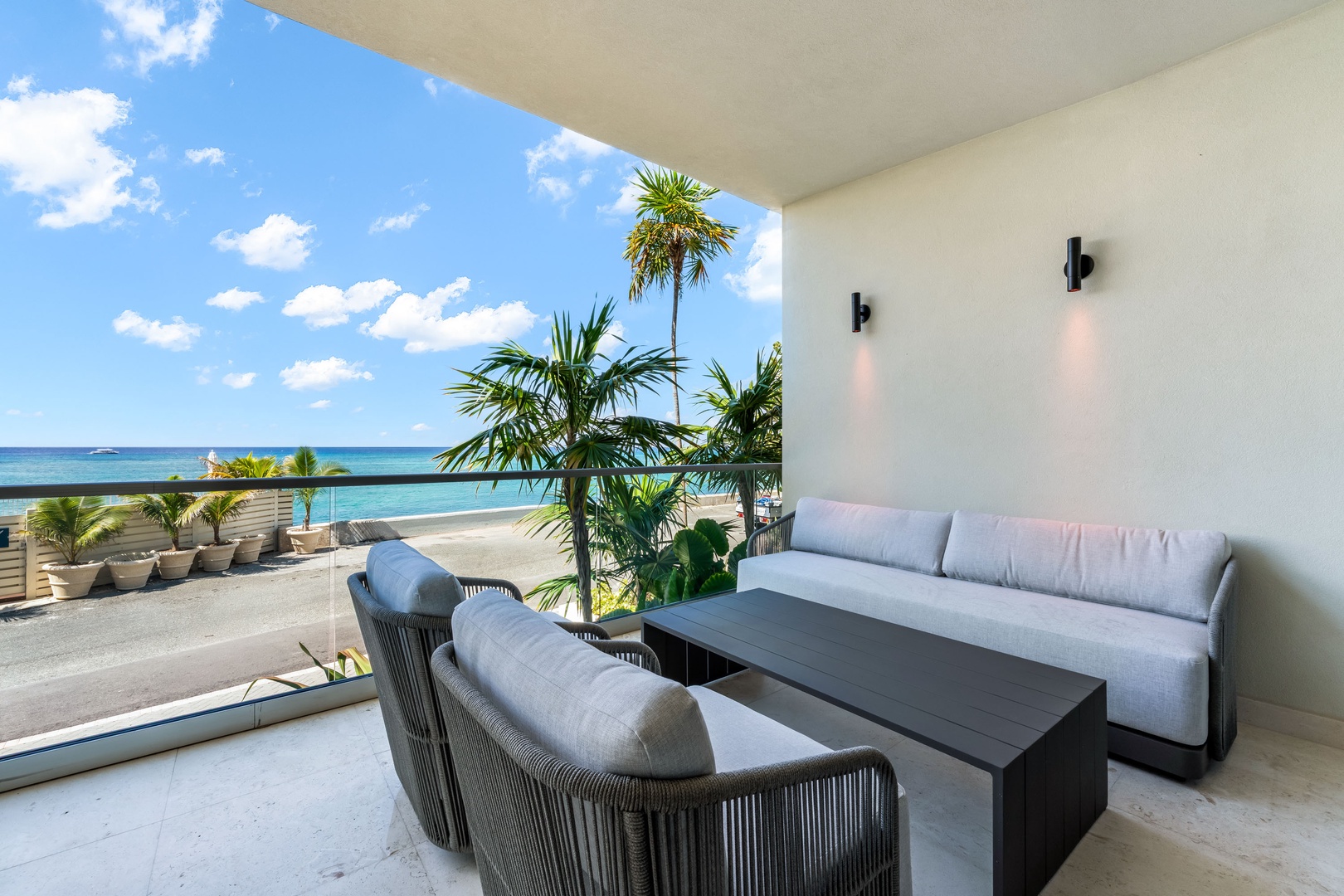 Private furnished balcony with ocean views.