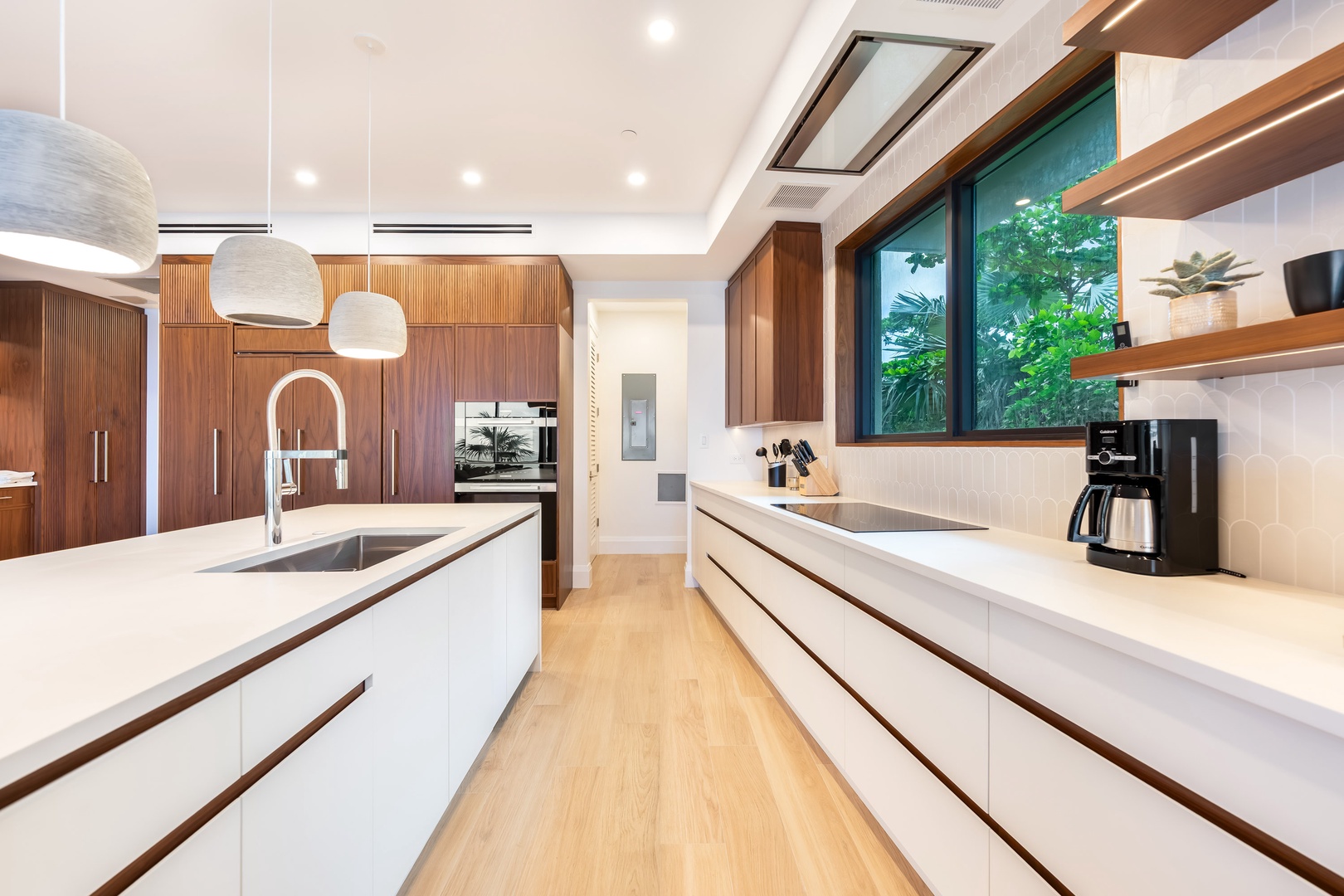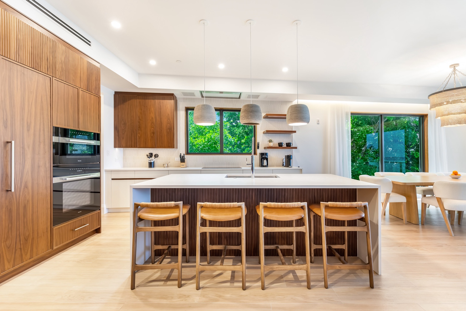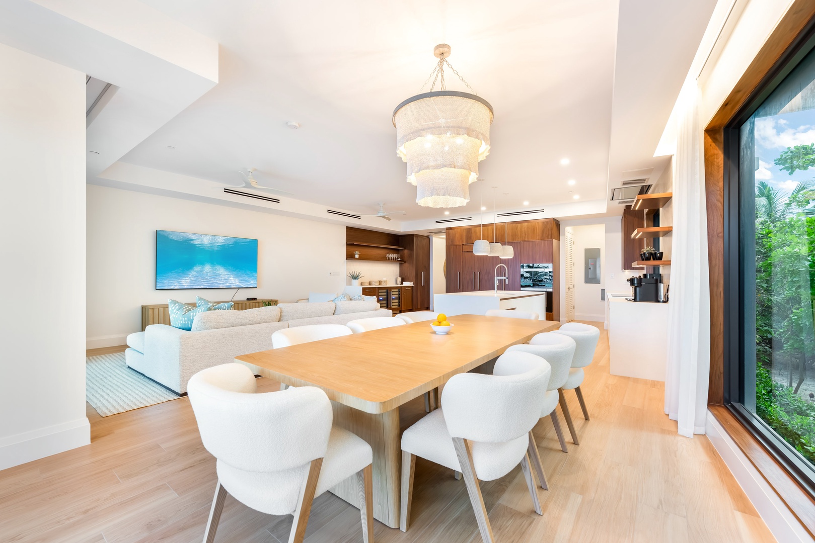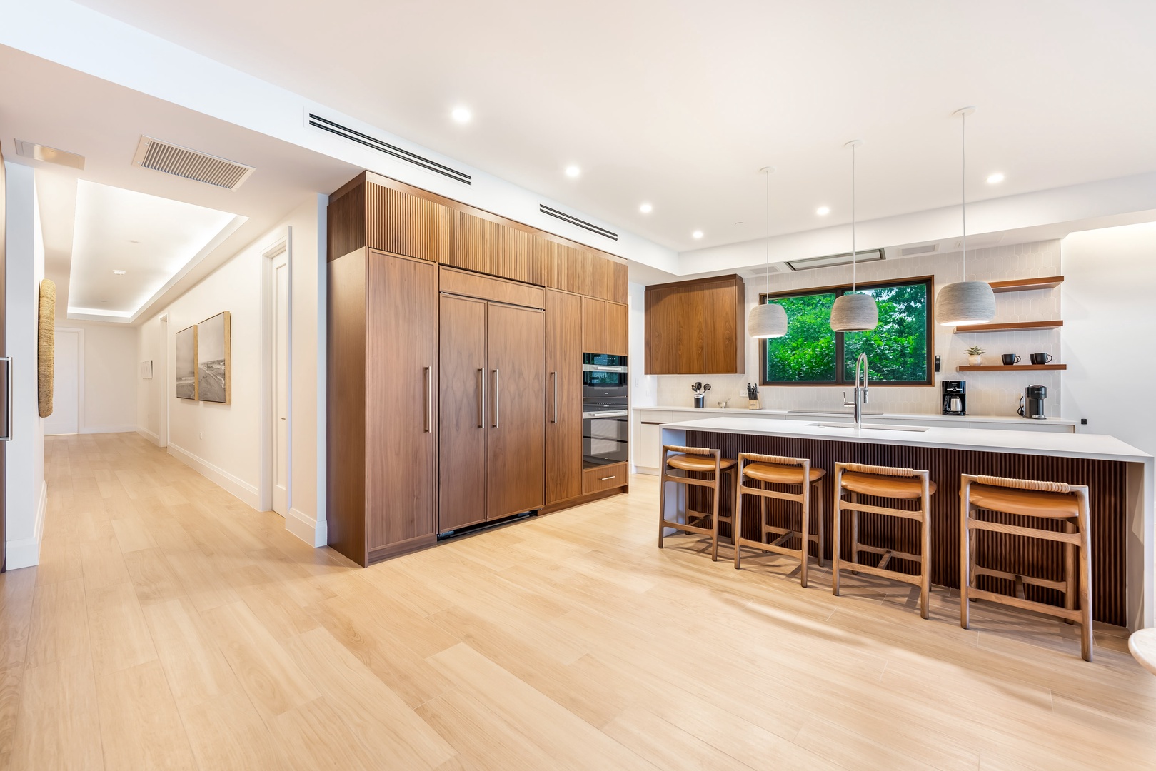 The chef’s kitchen, with top-of-the-line appliances and quartz countertops, is a culinary dream. A separate wine bar comes equipped with a sink and a beverage fridge.